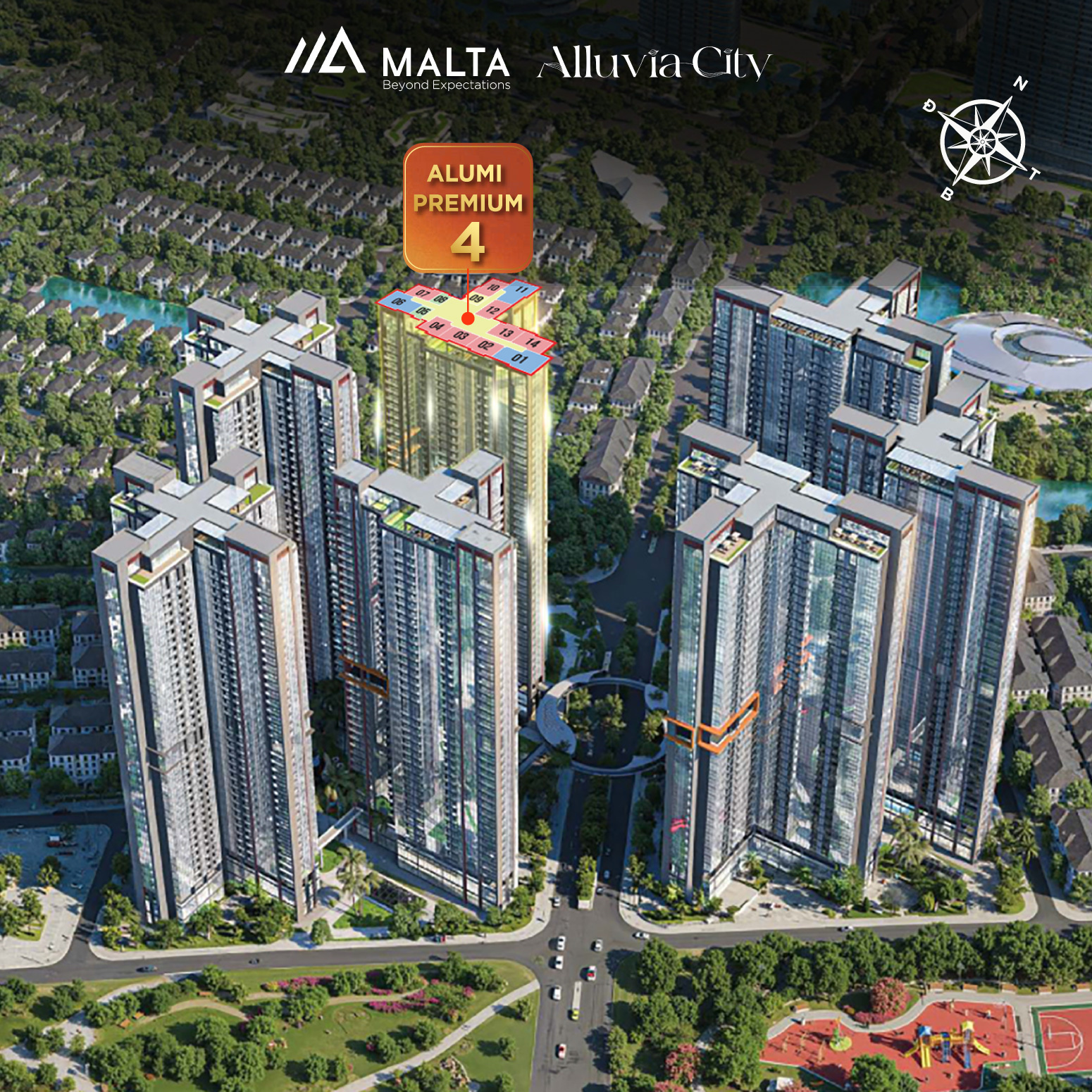 Alumi 4 nằm tại vị trí trung tâm phân khu Alumi, được bao quanh bởi các tòa cùng phân khu và công viên Alluvia Onsen.