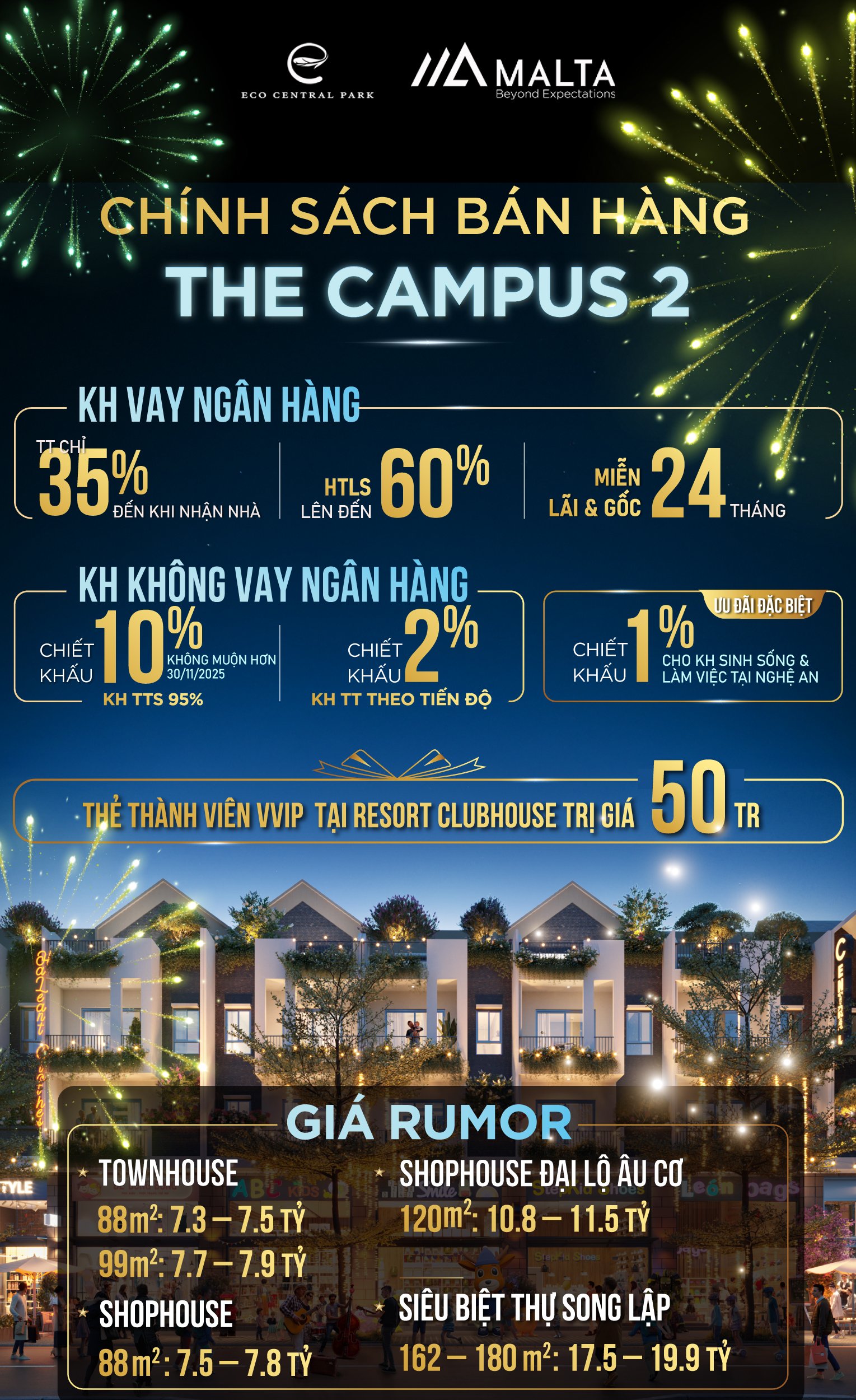 Được mệnh danh là nơi “mọi con đường” về nhà của cư dân Eco Central Park (rộng gần 200ha, tại phường Trường Vinh, tỉnh Nghệ An) đều đi qua, mọi ánh mắt của cư dân đều ngước nhìn, phân khu The Campus 2 tọa lạc tại cửa ngõ đón đầu mọi luồng di chuyển ra vào khu đô thị xanh lớn nhất Bắc Trung Bộ.